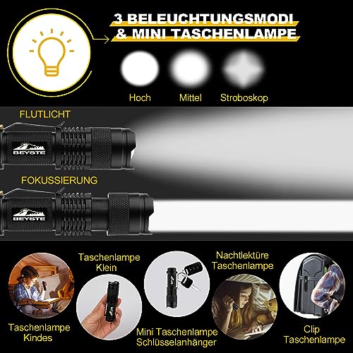 - Robust und langlebig: Diese Taschenlampe ist gebaut, um den Elementen zu trotzen. Egal ob beim Camping, Wandern, Angeln oder bei Stromausfällen – die BEYSTE LED Taschenlampe lässt Sie nicht im Dunkeln stehen.