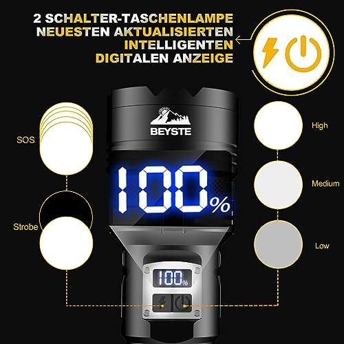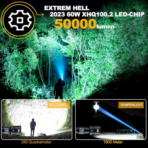 Stellen Sie sich vor, Sie sind mitten im Wald, es ist stockdunkel und Sie hören ein Rascheln im Gebüsch. Keine Sorge, mit der BEYSTE LED Taschenlampe sind Sie bestens gerüstet! Diese Taschenlampe ist nicht nur extrem hell, sondern auch ein wahres Multitalent. Mit einer Lichtleistung von 50.000 Lumen und einem 60W XHQ100.2 Chip ausgestattet, durchdringt sie mühelos Staub und dichten Nebel. Ihr Lichtstrahl kann eine Fläche von 280 Quadratmetern ausleuchten oder Objekte in einer Entfernung von bis zu 1600 Metern fokussieren. Das ist so hell, dass selbst die Glühwürmchen neidisch werden!